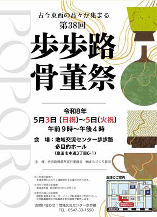| ☆第38回歩歩路骨董祭のご案内☆ 〇日時 令和8年5月3日(日祝)~5月5日(火祝) 午前 9時~午後4時 〇場所 島田市地域交流センター歩歩路 多目的ホール(島田市本通3丁目6番の1) 〇主催 骨董祭実行委員会・㈱まちづくり島田 |