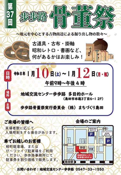 | ☆第37回歩歩路骨董祭のご案内☆ 〇日時 令和8年1月10日(土)~1月12日(月・祝) 午前 9時~午後4時 〇場所 島田市地域交流センター歩歩路 多目的ホール(島田市本通3丁目6番の1) 〇主催 骨董祭実行委員会・㈱まちづくり島田 |