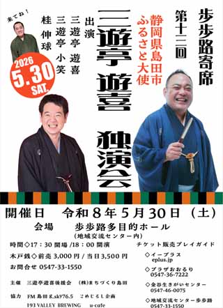 | ☆第13回 歩歩路寄席のご案内☆ 〇日 時 令和8年5月30日(土) 〇時 間 17:30開場 / 18:00開演 〇会 場 島田市地域交流センター歩歩路 多目的ホール 〇木戸銭 前売り3,000円 /当日3,500円 〇プレイガイド 地域交流センター歩歩路 島田市本通3丁目6-1 プラザおおるり 島田市中央町5-1 夢づくり会館 島田市島550-2 イープラス 〇お問い合わせ 0547-33-1550 ※チケット好評販売中 |
